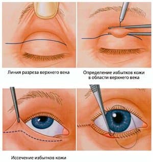 Операция проводится на голодный желудок, под общим наркозом, длится в среднем 1–1,5 часа. Хирург наносит разметку на веки, обозначая линии разрезов. Они делаются по естественным складкам век или под ресничным краем. При трансконъюктивальной пластике — на внутренней стороне века. Во время операции удаляется избыточная кожа и жировые отложения, при необходимости проводится подтяжка мышц. Остатки ткани перераспределяются, чтобы воссоздать ровную естественную поверхность века. Разрезы закрывают тонкими швами.