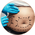 - Абдоминопластика: Отслаивание кожно-жирового лоскута, устранение диастаза (сшивание мышц живота), удаление излишков кожи и жира, перенос пупка, натяжение оставшейся кожи;